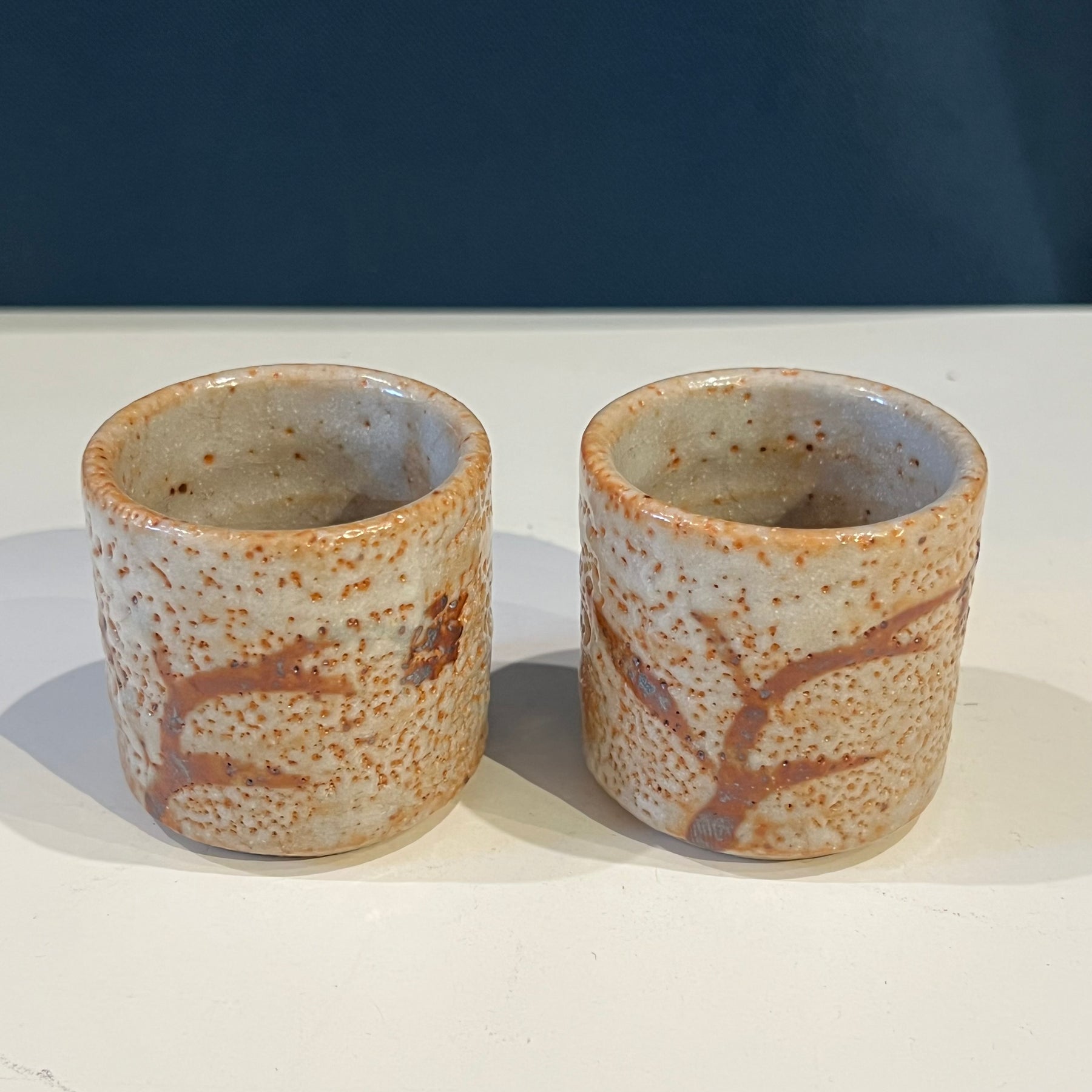 Pair of small shino ware ceramic sake cups with bamboo leaf design from the 1960s. Unmarked.