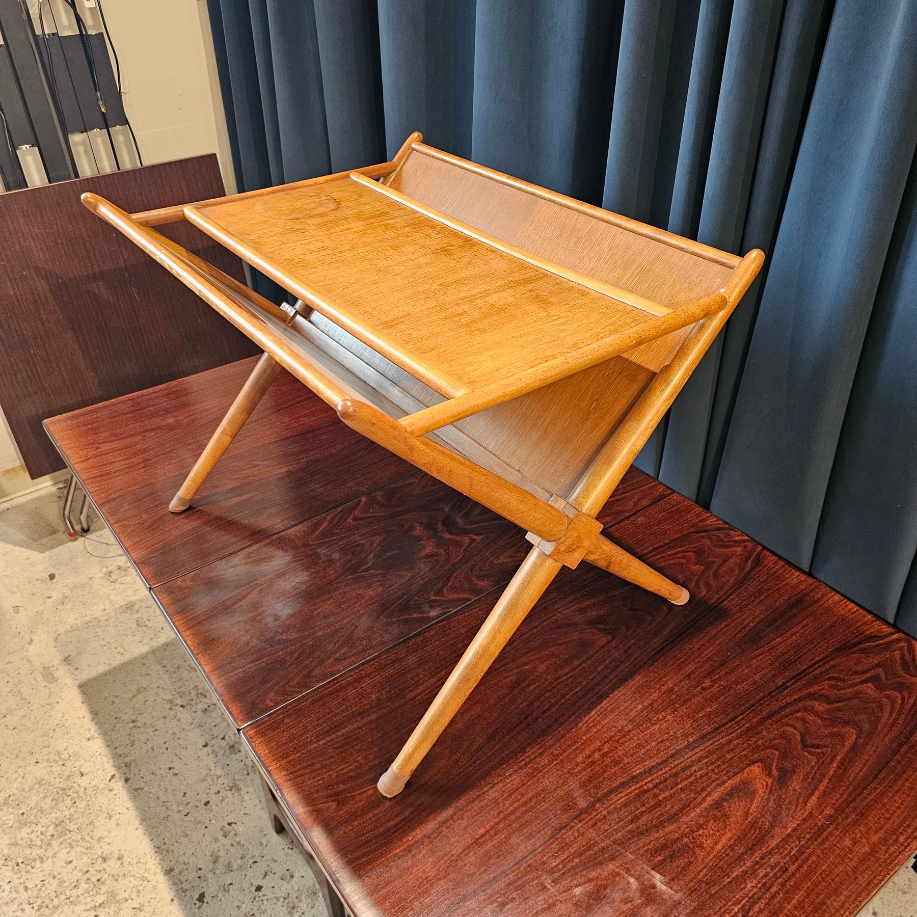 Exceptional T.H. Robsjohn-Gibbings magazine table manufactured by Widdicomb, fashioned from exquisite natural walnut in the 1950s. This generously proportioned side table offers elegant dual-sided magazine storage, embodying a significant chapter in design heritage. The piece displays a charming patina with modest cosmetic imperfections, including subtle water rings and occasional discoloration.