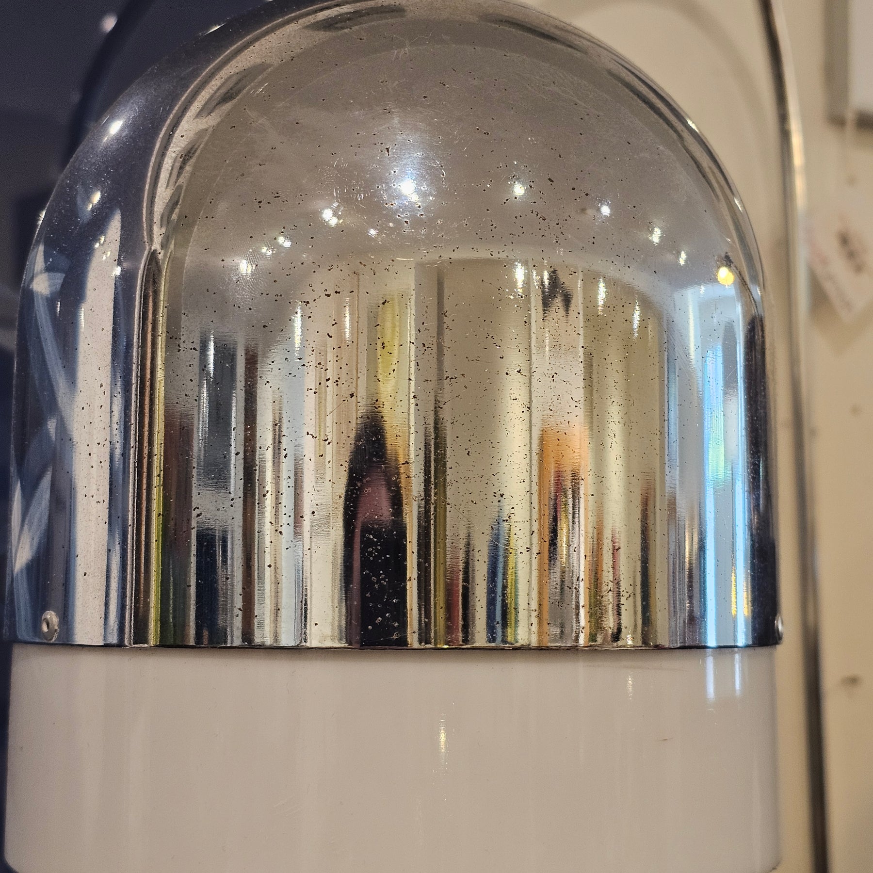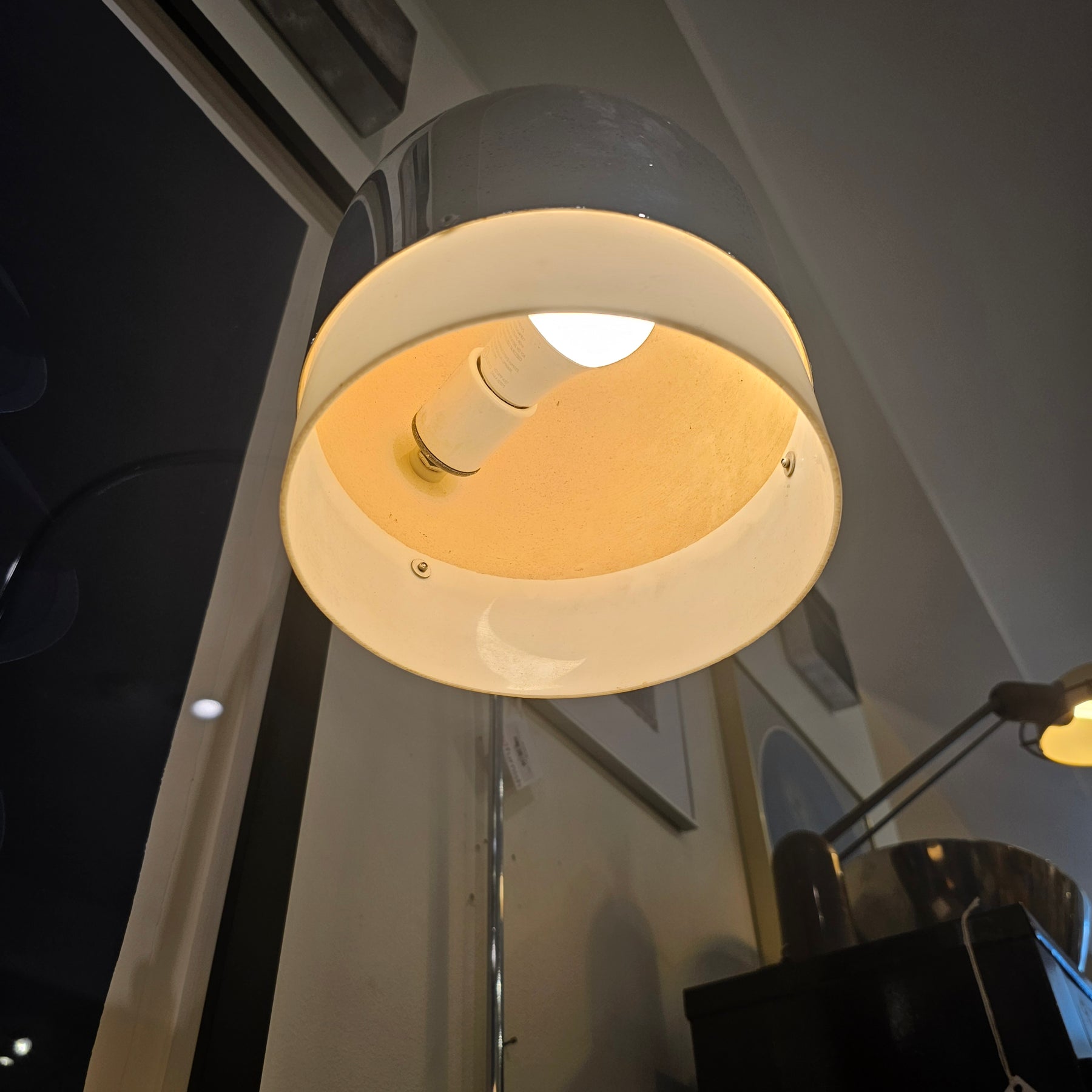 In the style of Guzzini, Reggiani, and Sonneman. Features an adjustable support bracket that allows for easy height changes and 180-degree swing movement. The shade is also adjustable for directional lighting. A striking piece with minor finish wear consistent with age; original wiring remains in good working condition.