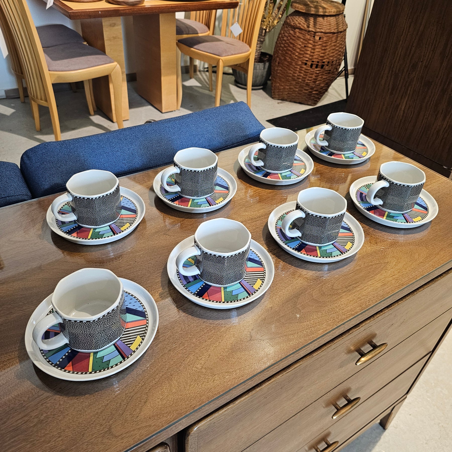 Outstanding set of eight coffee mugs and accompanying saucers.   Designed by Barbara Brenner for Rosenthal.