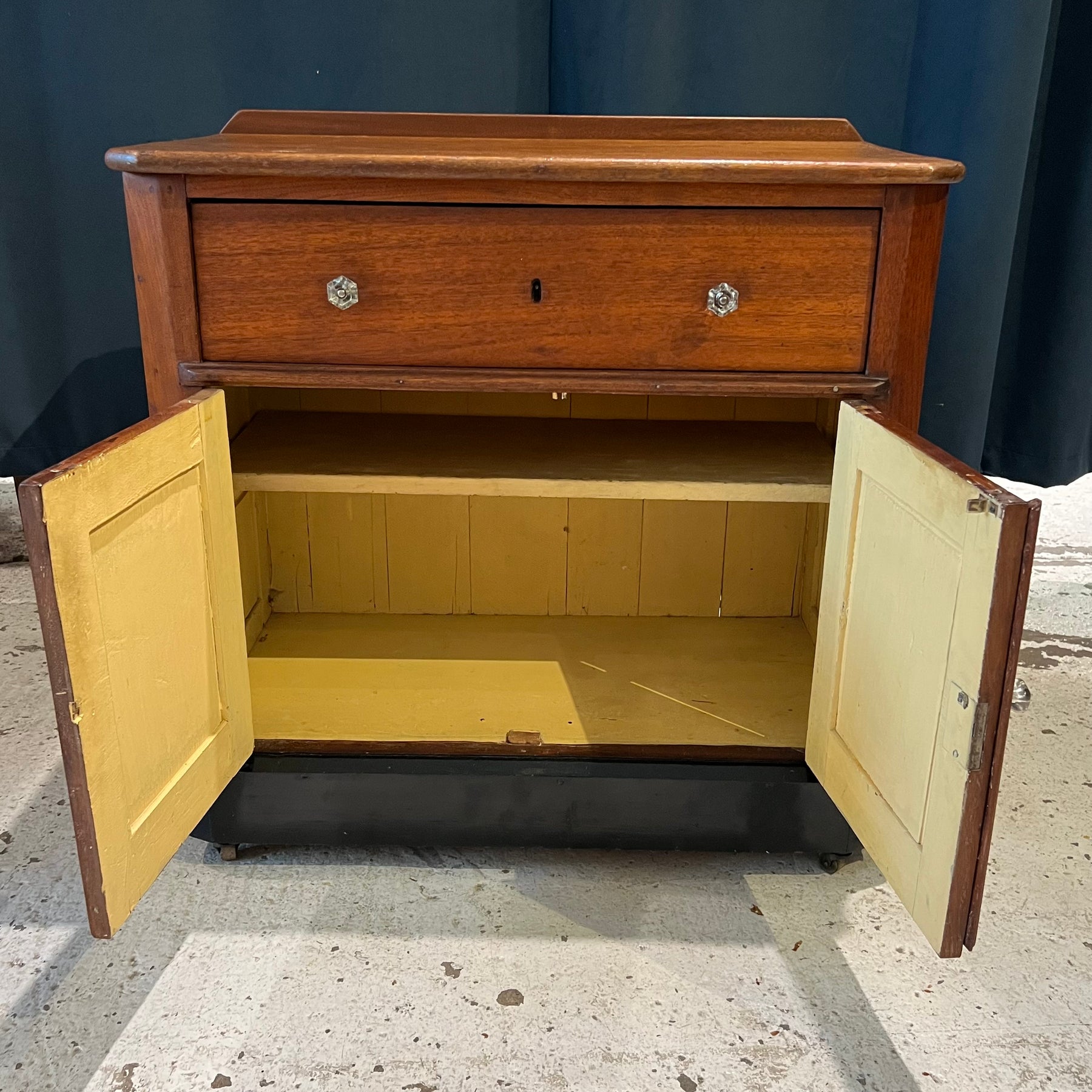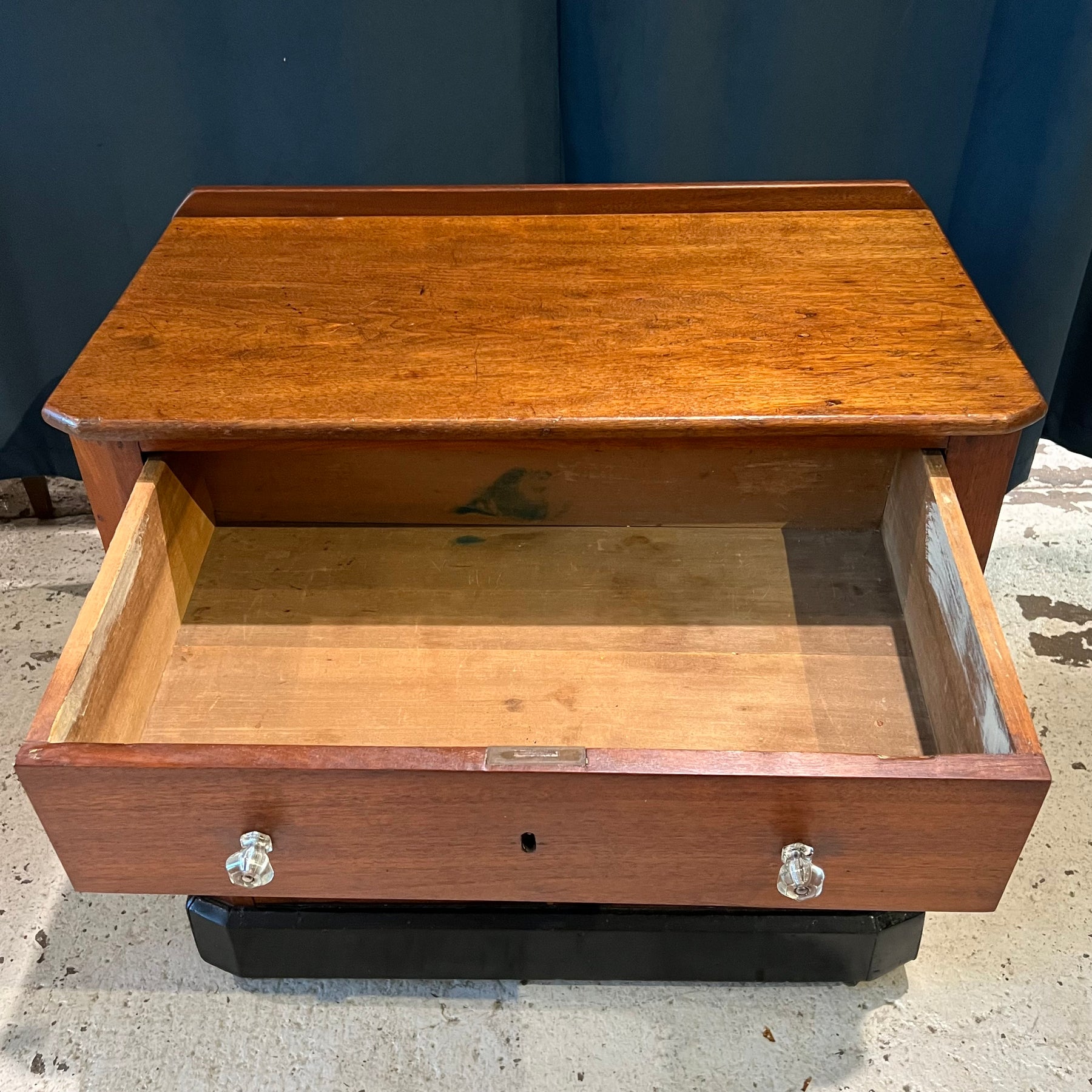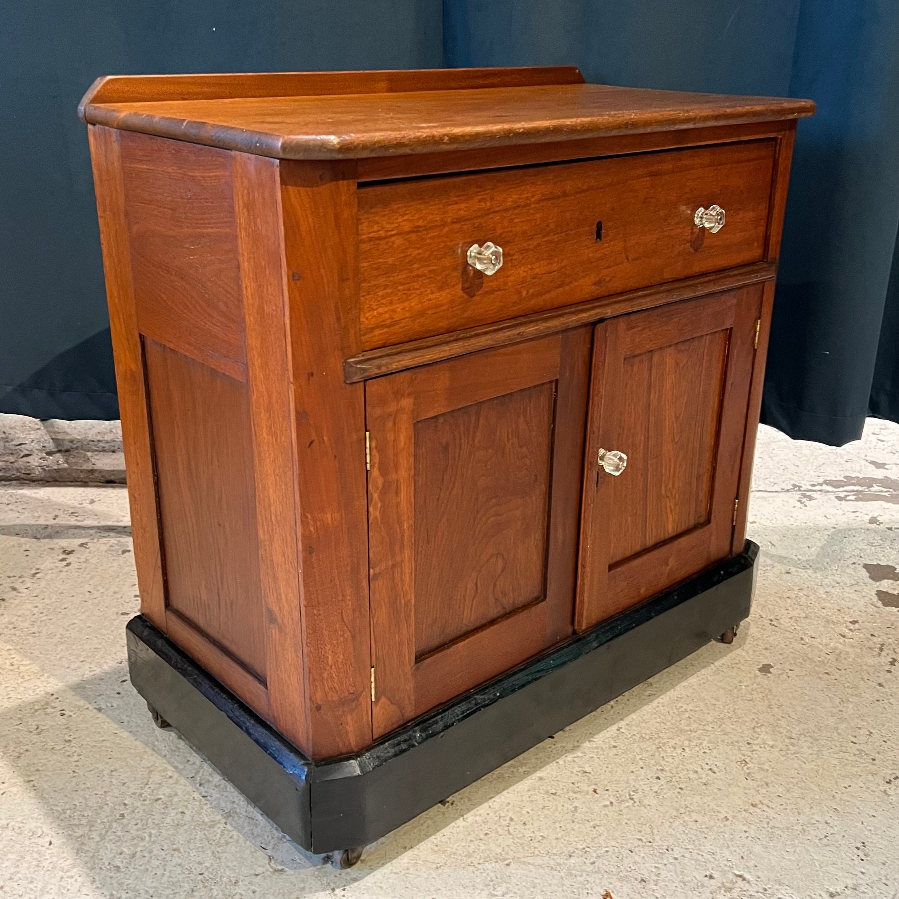 Unique antique walnut cabinet on casters. Great for use as an entryway key drop or kitchen storage. Original glass knobs. Base is painted in a glossy black lacquer.