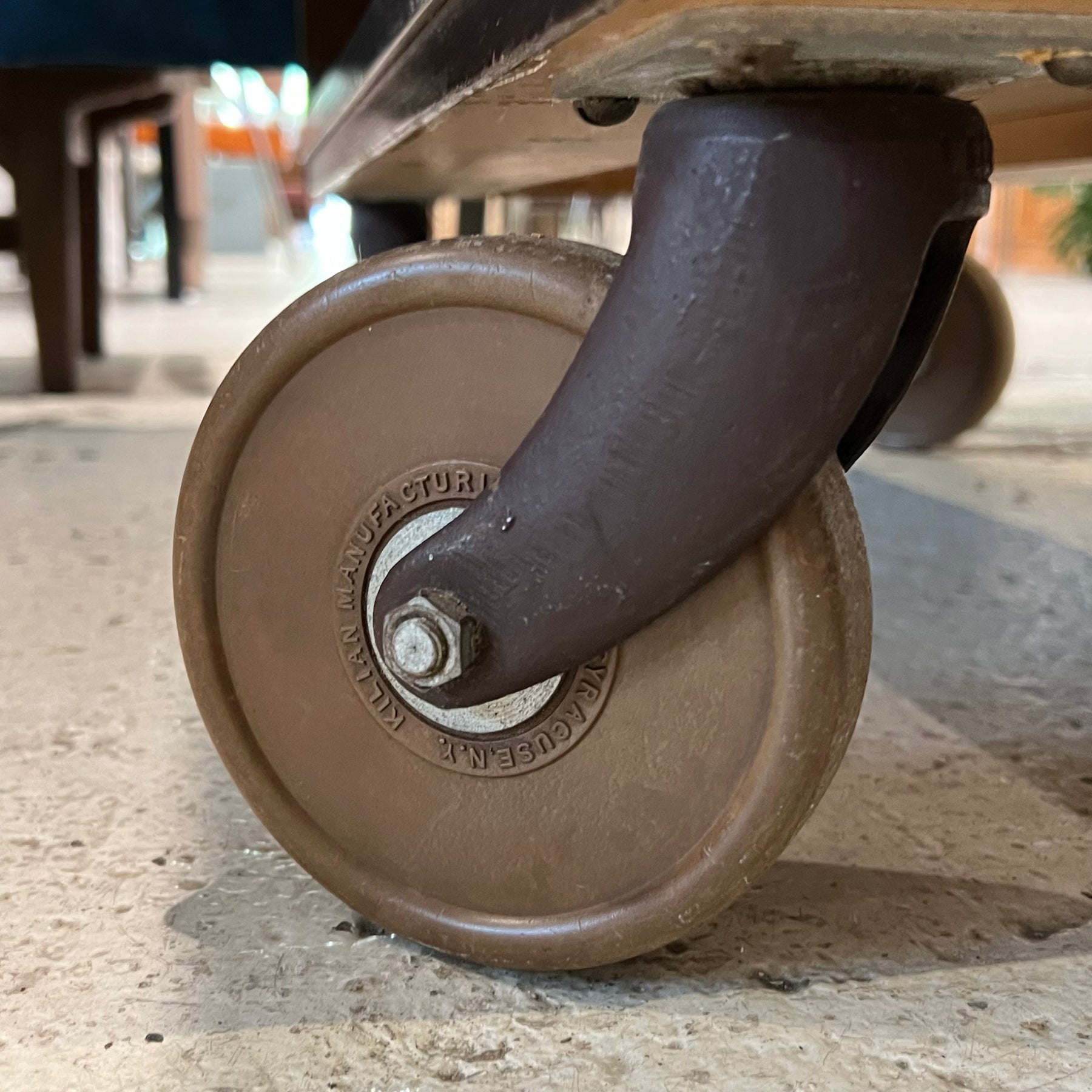 Vintage Gaylord Bros. rolling wood book cart with a dark brown finish. 5” brown rubber casters. Some scratches and wear consistent with age and use.