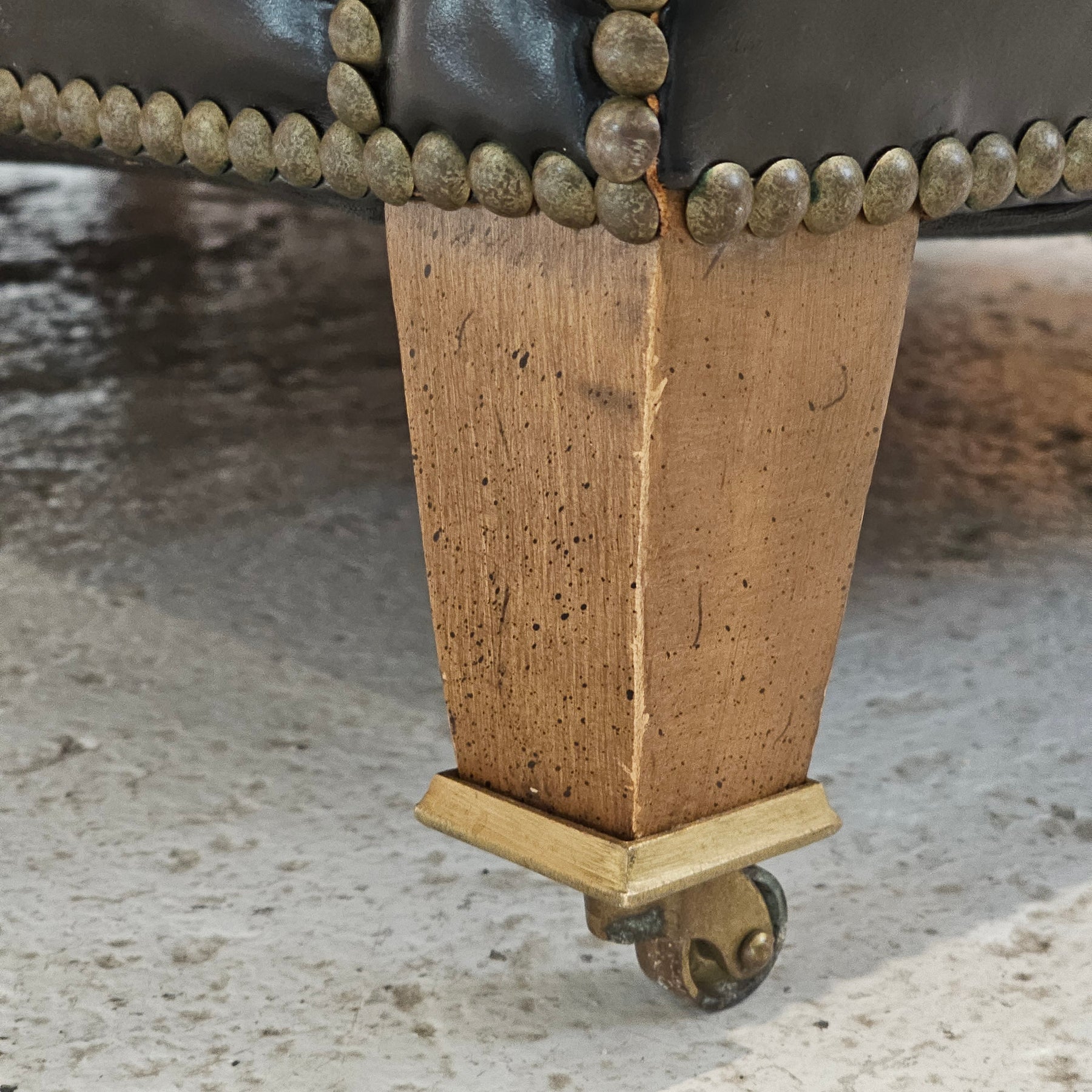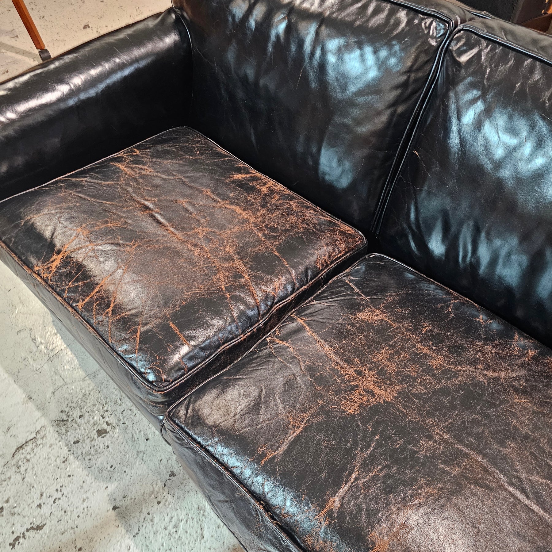 Beautifully aged vintage black leather sofa with rich patina and timeless character. Generously scaled at 89" long, this piece features plush cushions for exceptional comfort and a relaxed, lived-in feel. The supple leather has developed a warm, natural sheen over time, emphasizing its authenticity and quality craftsmanship.