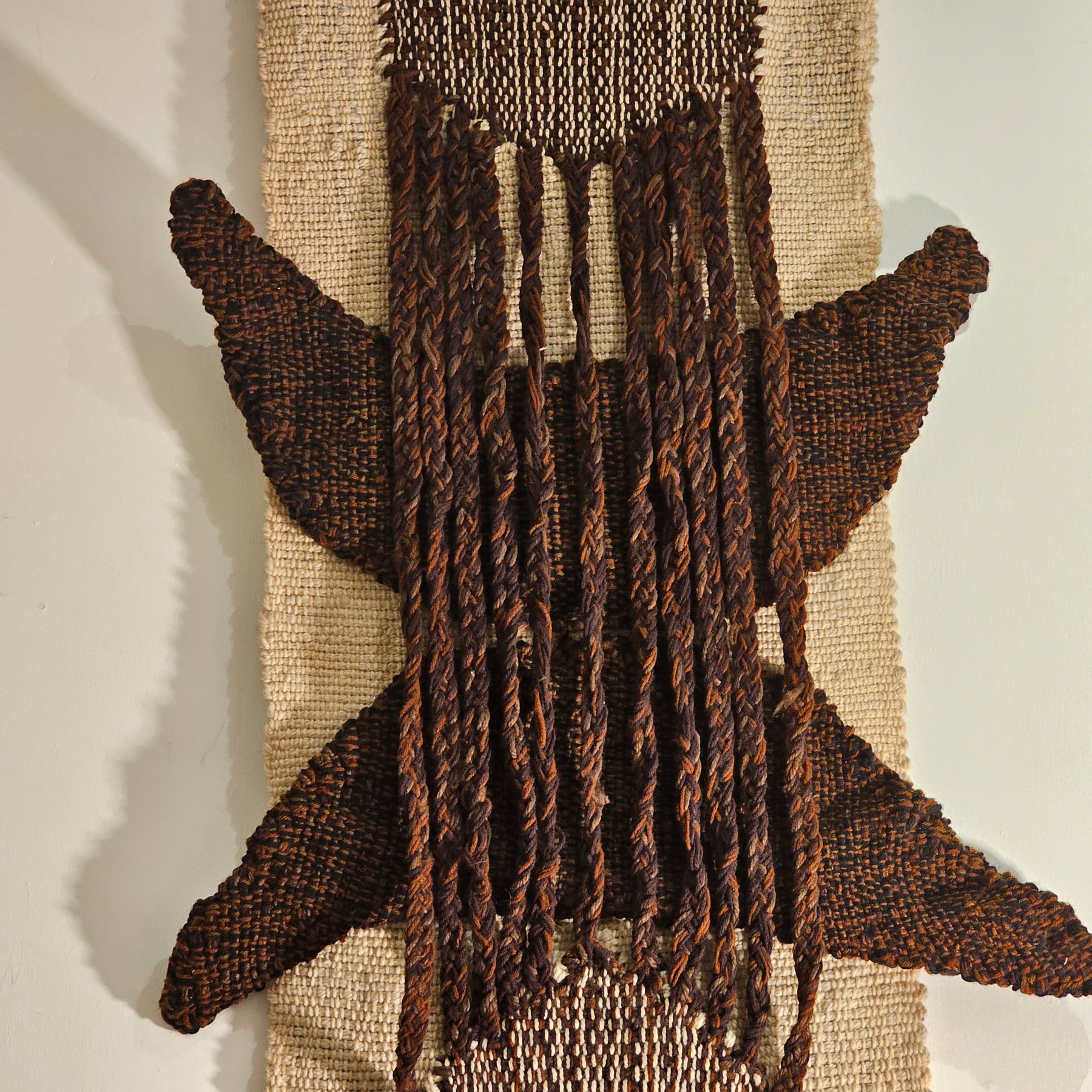 Striking handwoven Japanese wool tapestry, featuring bold geometric and organic forms in natural cream and deep brown tones. Textural braids and fringe add sculpture depth, making it a standout wall piece with both rustic and modernist appeal. Likely mid-20th century, this textile is signed with an initial "Z" in the lower corner.