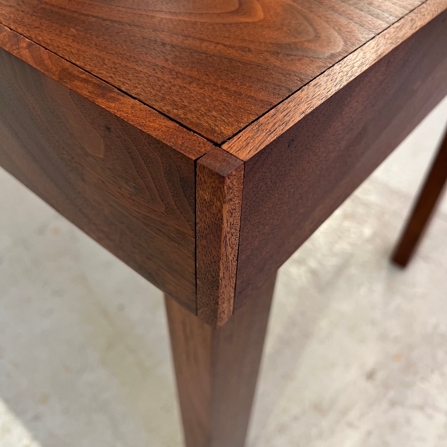 Beautiful solid walnut table, designed and built by renowned visual artist and educator, Roman Verastko, for himself in the 1970s, and used until his death in 2024 at the age of 94. Top has been fully restored in a dark Danish oil with a paste wax finish. Beautiful grain and subtle design considerations such as the narrow corner pieces on the top.
