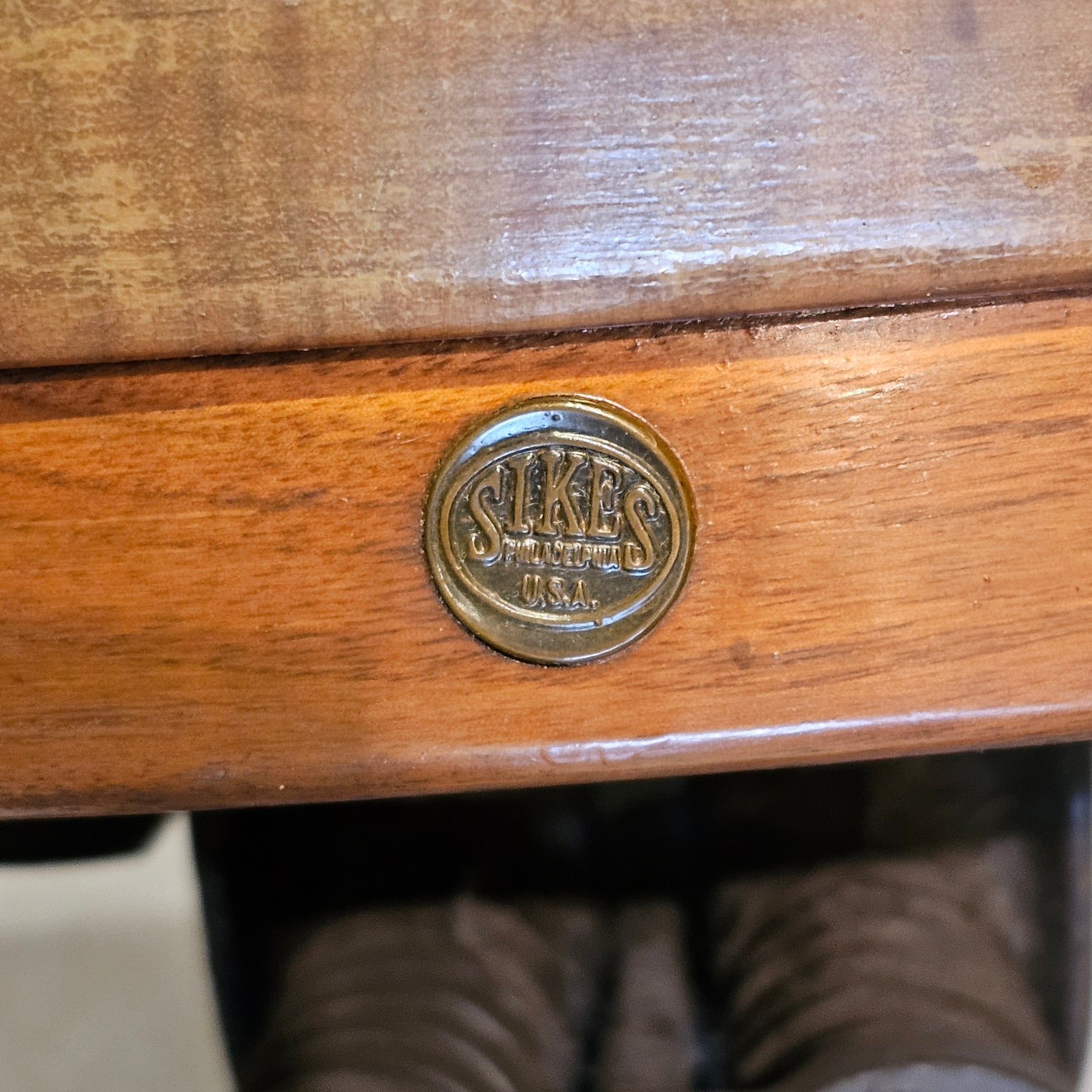 Adjustable Sikes Swivel Oak Desk Chair. Originally from the Minneapolis Courthouse. Patina and age throughout, with newer casters.
