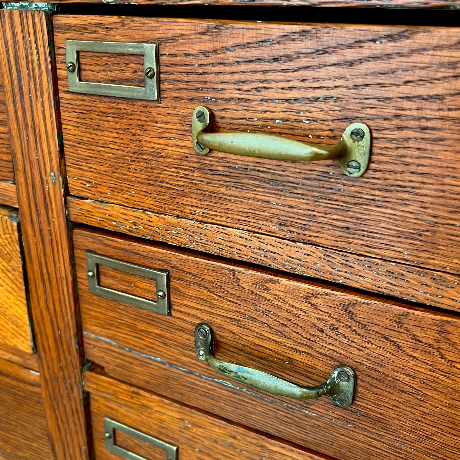 Fantastic 22-drawer rolling solid oak flat file. One side is solid pine, but it has been stained to match. It would appear it has been refinished at some point. Drawer interiors are clean but have stains and other signs of use. Brass pulls and label holders.