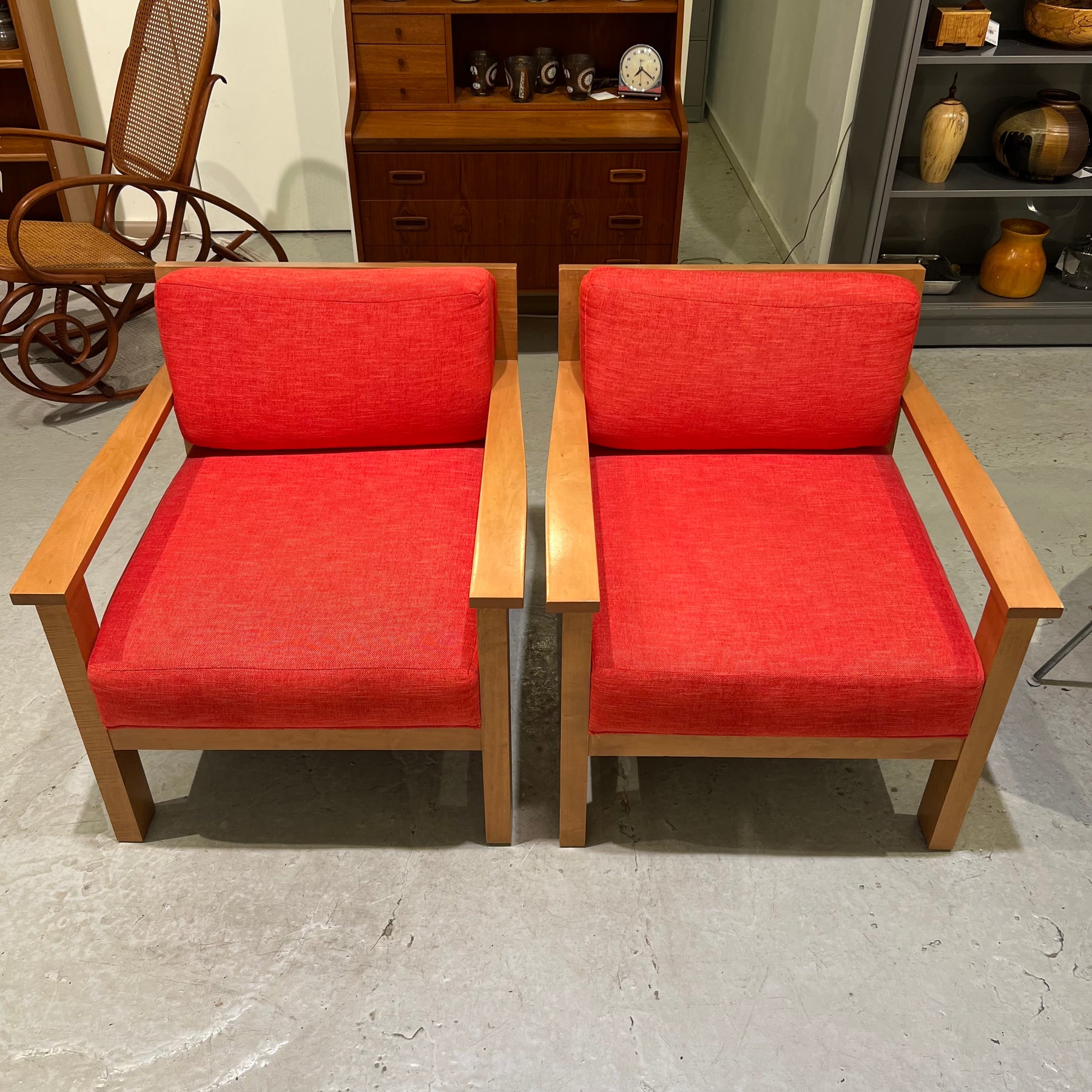 Eaton Custom Seating contemporary maple lounge chair with soft red upholstery in excellent condition.