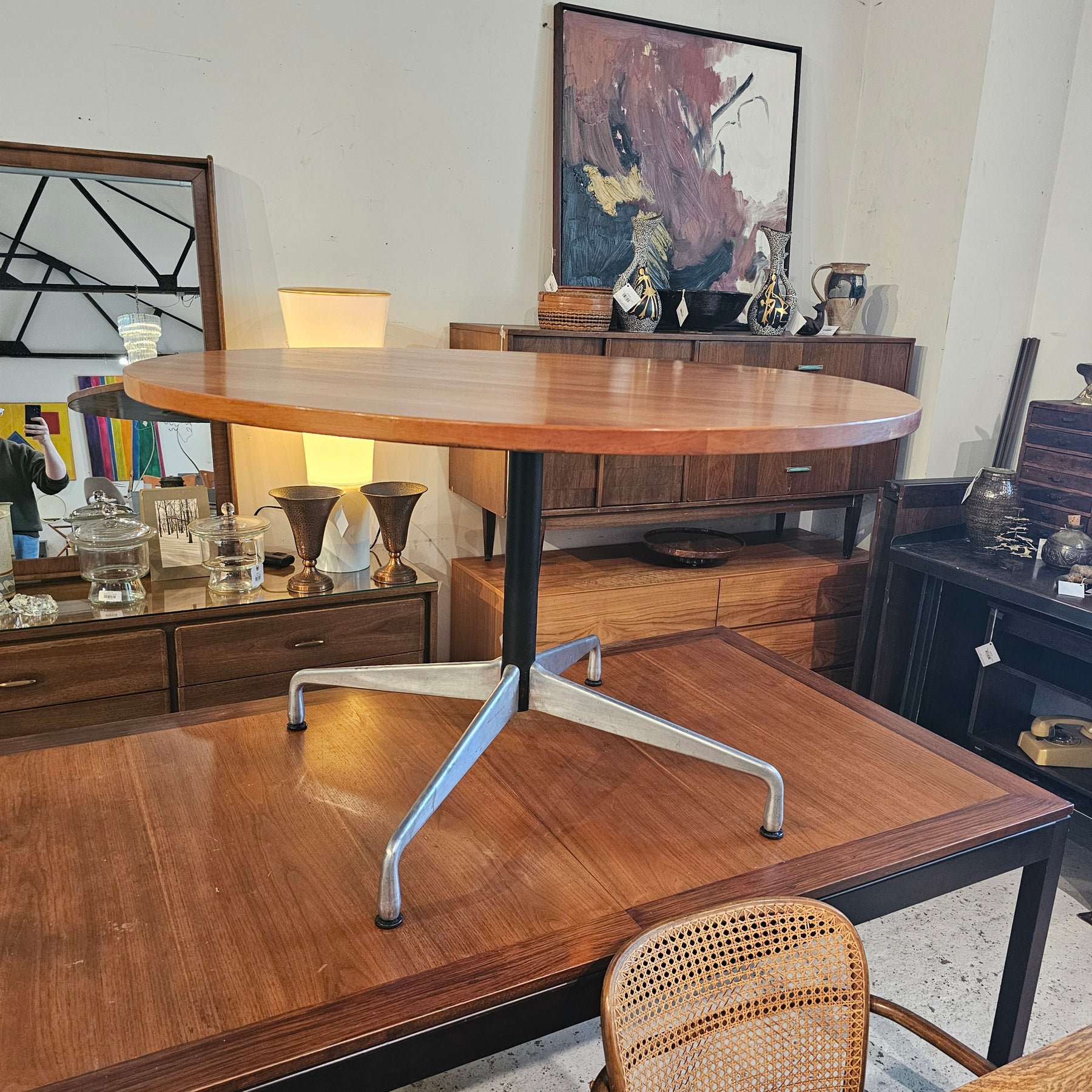 Round table with Herman Miller base and custom cherry wood top.