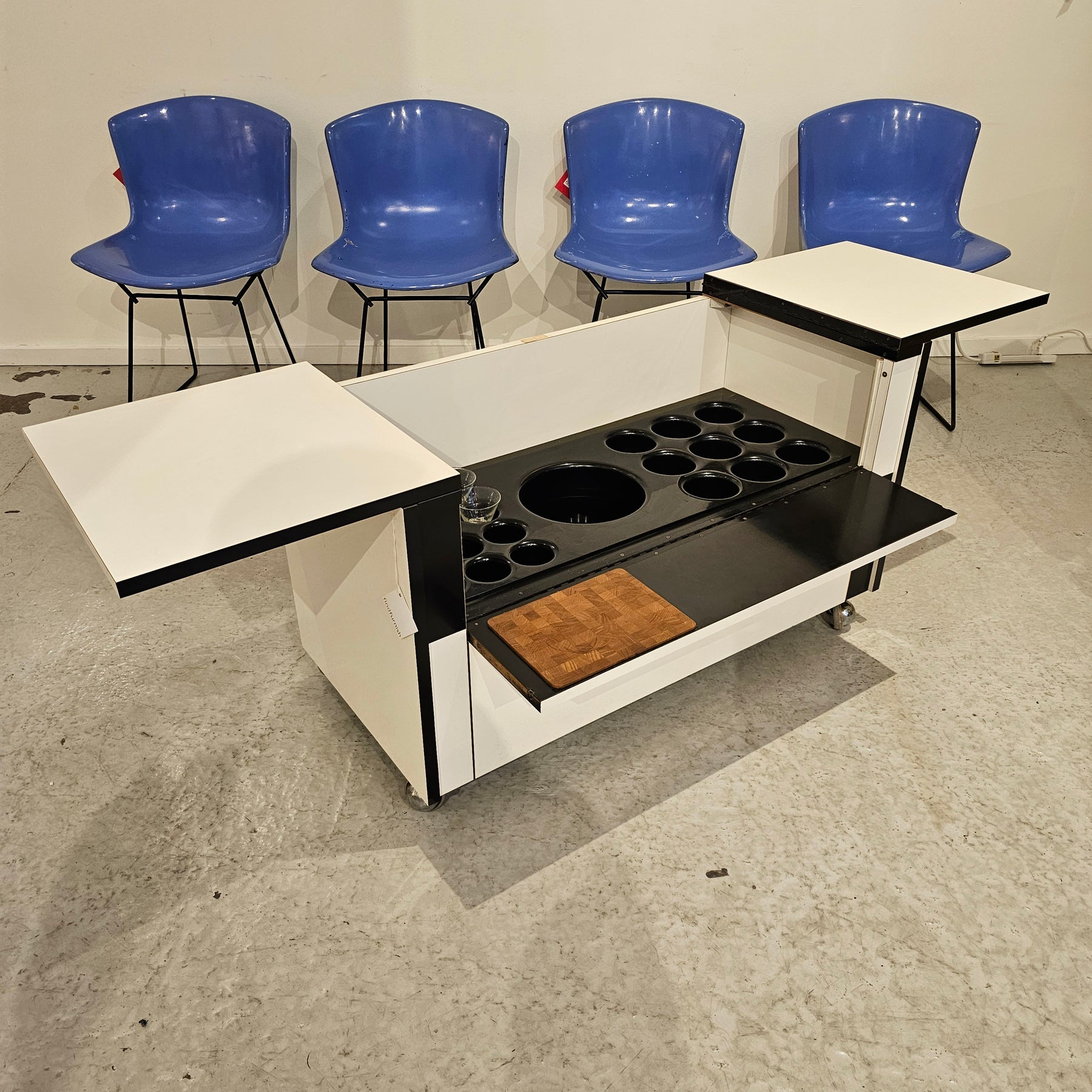 Discover this incredible, one-of-a-kind bar cart from the Space Age. Decorated with black and white laminate, it's in pristine condition with no chips or wear. The top opens to reveal a plastic divider for storing glassware, bottles, and an ice bucket, while the front drops down for easy access and even includes a built-in cutting board. Don't miss out on this opportunity!