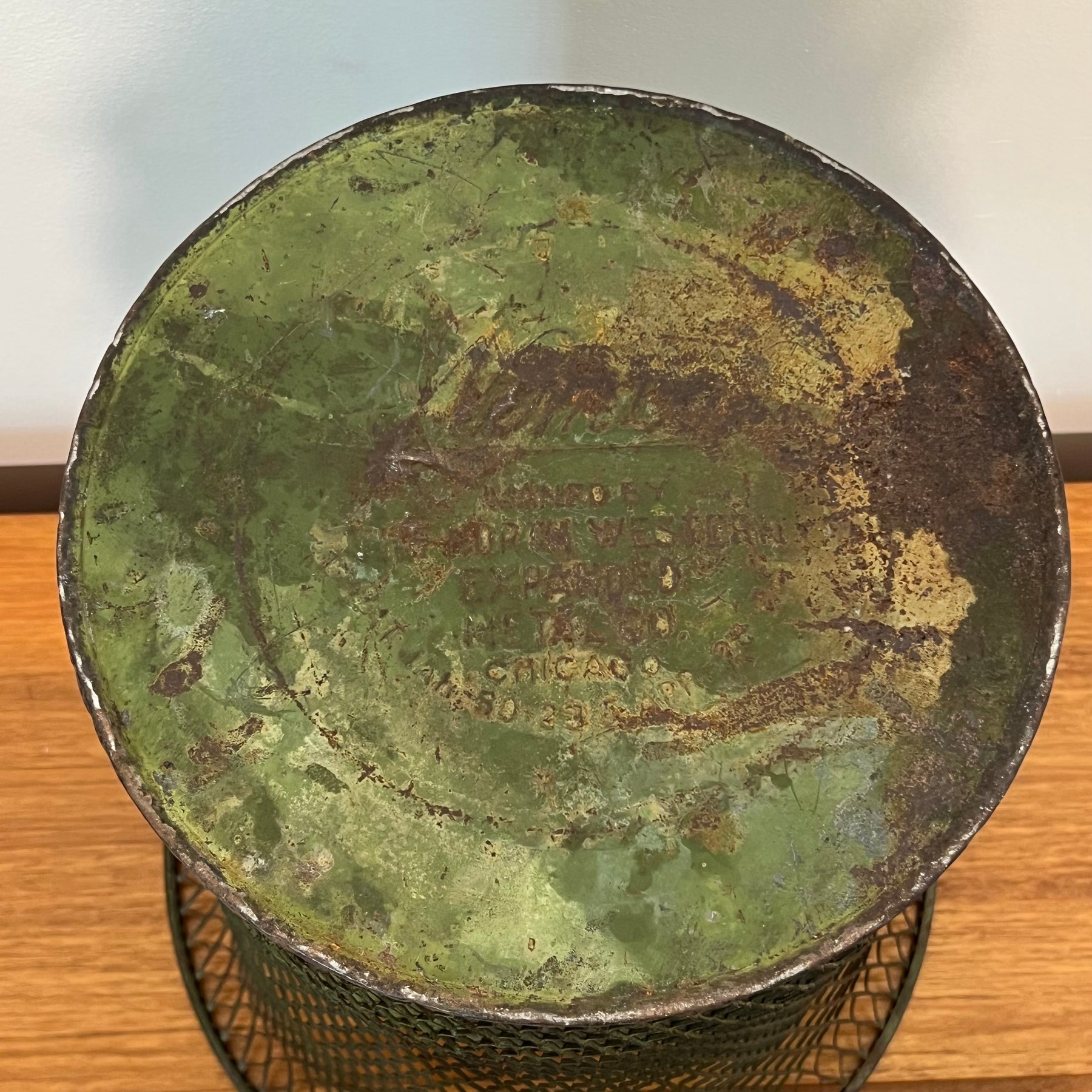 These NEMCO steel mesh wastebaskets are getting harder and harder to find! Here’s a nice clean green one with amazing patina.