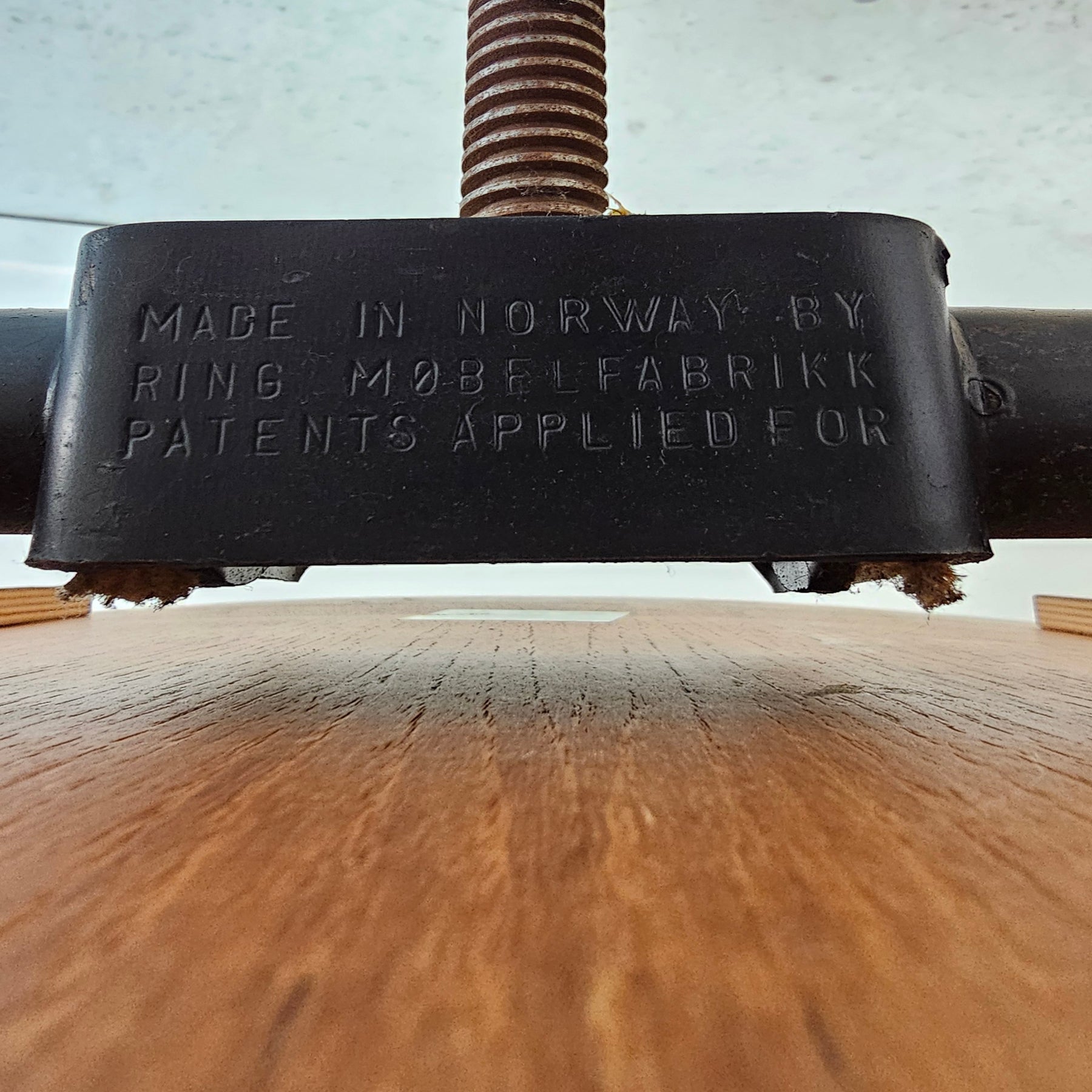 This truly rare executive armchair designed by Jorgen Rasmussen for Kevi features a high back frame made of bent ply on an iron based includes rotary adjustment mechanisms. The base includes original manufacturers stamp.  The seat pads attach/detach easily with velcro so can be replaced if desired, though they are still in good condition considering their age.  The frame of the chair does show some dings/scratches, primarily to the backrest.