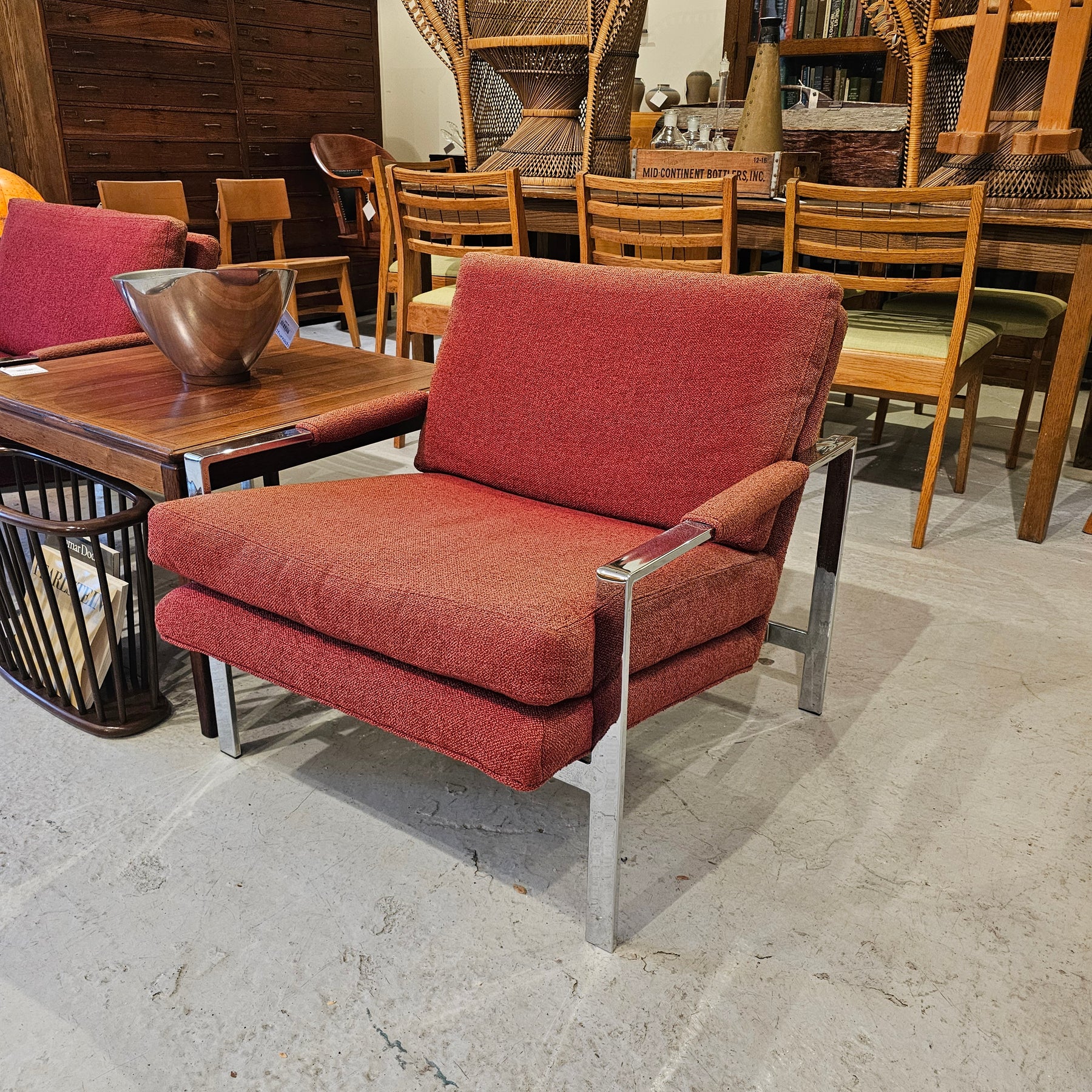 Milo Baughman Lounge Chair. Original red upholstery shows some sun fading, but otherwise in good condition. Each sold individually.